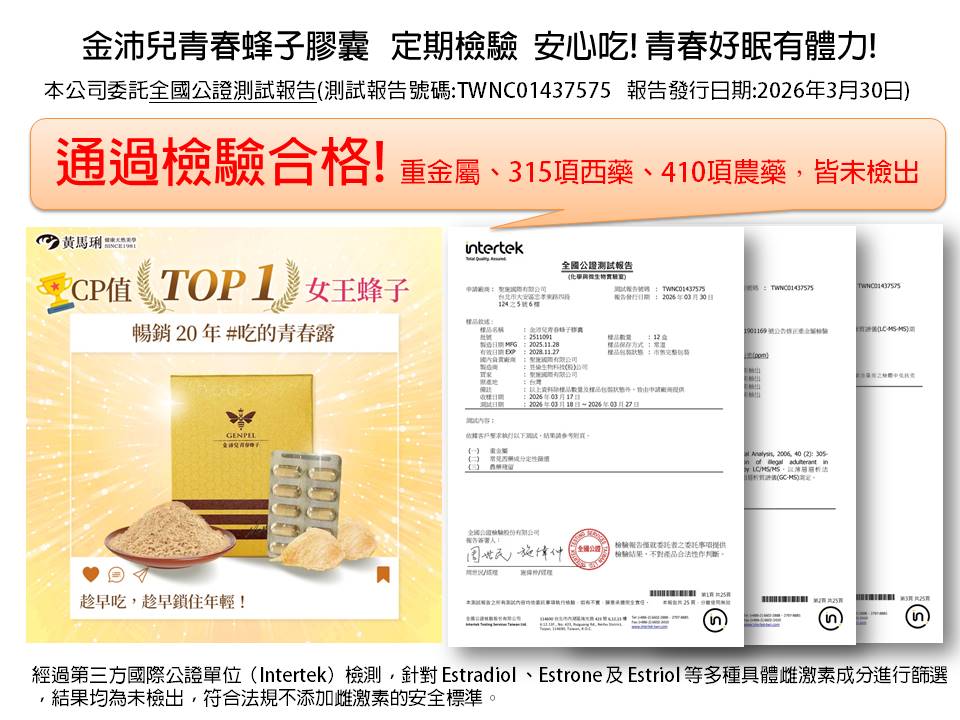金沛兒青春蜂子及金沛兒蜂胎王 檢驗合格